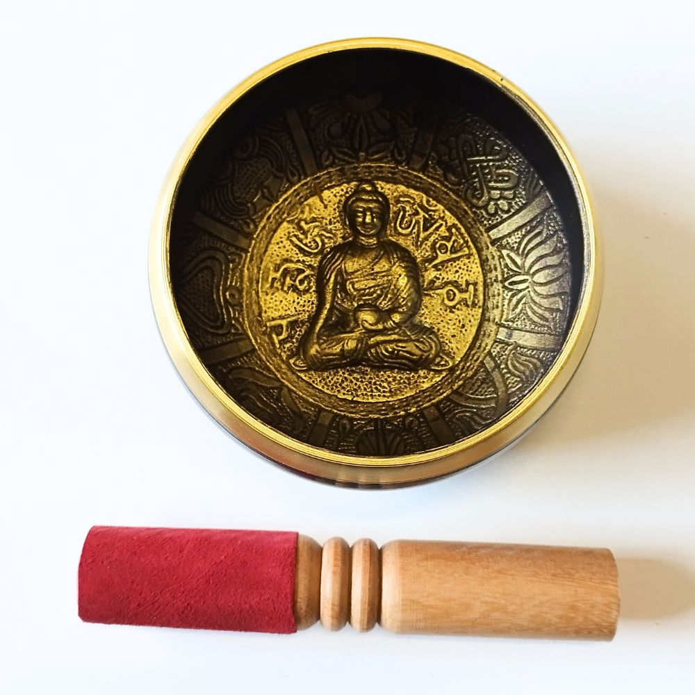 Cuenco de bronce en negro con símbolos budistas de escritura en Sánscrito.