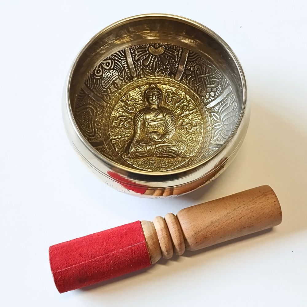 Cuenco tibetano de bronce con grabados budistas.