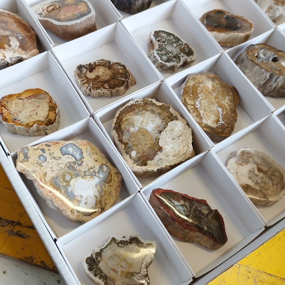 Piezas de Xilópalo o madera fósil. Una cara pulida. En cajitas de 6x6cm.