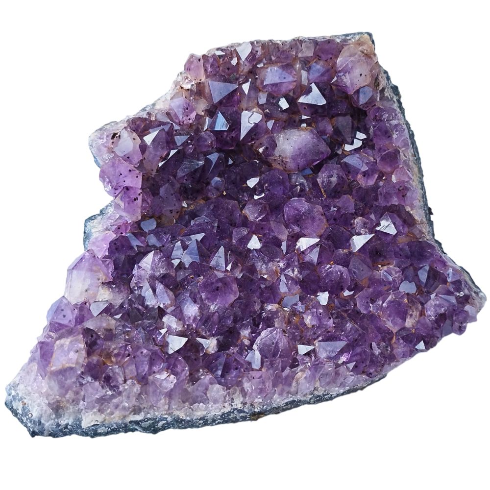 La drusa de amatista es una agrupación de cristales de cuarzo púrpura que crecen de forma natural sobre una base o matriz común, generalmente tapizando el interior de geodas volcánicas. Se caracteriza por presentar múltiples puntas cristalinas que reflejan la luz intensamente, mostrando tonalidades que varían desde el violeta pálido hasta el púrpura profundo debido a la presencia de hierro. Es una de las formaciones más estéticas en el coleccionismo, muy valorada tanto por su brillo vítreo como por su uso decorativo y en prácticas de bienestar.