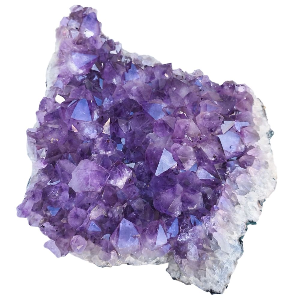 La drusa de amatista es una agrupación de cristales de cuarzo púrpura que crecen de forma natural sobre una base o matriz común, generalmente tapizando el interior de geodas volcánicas. Se caracteriza por presentar múltiples puntas cristalinas que reflejan la luz intensamente, mostrando tonalidades que varían desde el violeta pálido hasta el púrpura profundo debido a la presencia de hierro. Es una de las formaciones más estéticas en el coleccionismo, muy valorada tanto por su brillo vítreo como por su uso decorativo y en prácticas de bienestar.