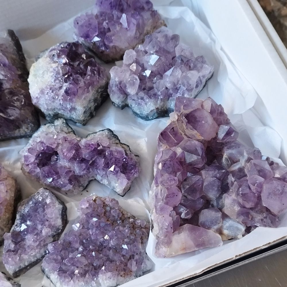Estas impresionantes estructuras se originan en cavidades de rocas volcánicas y sedimentarias, donde los cristales de amatista crecen en la superficie interna, creando espectaculares paisajes minerales. Muy valoradas en el coleccionismo, las drusas de amatista destacan por su brillo, profundidad de color y la belleza de sus cristales, convirtiéndolas en piezas esenciales para cualquier colección de minerales.