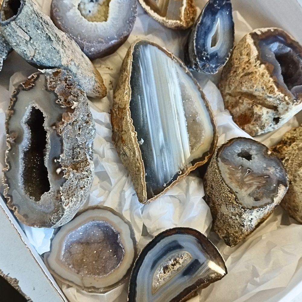 Al abrirlas, revelan un interior que puede ser hueco, estar lleno de ágata sólida o presentar un corazón de microcristales de cuarzo. Muy apreciadas en decoración y coleccionismo, destacan por su asombrosa variedad cromática, su dureza y el hipnótico contraste entre su corteza exterior rústica y su núcleo pulido o cristalino.