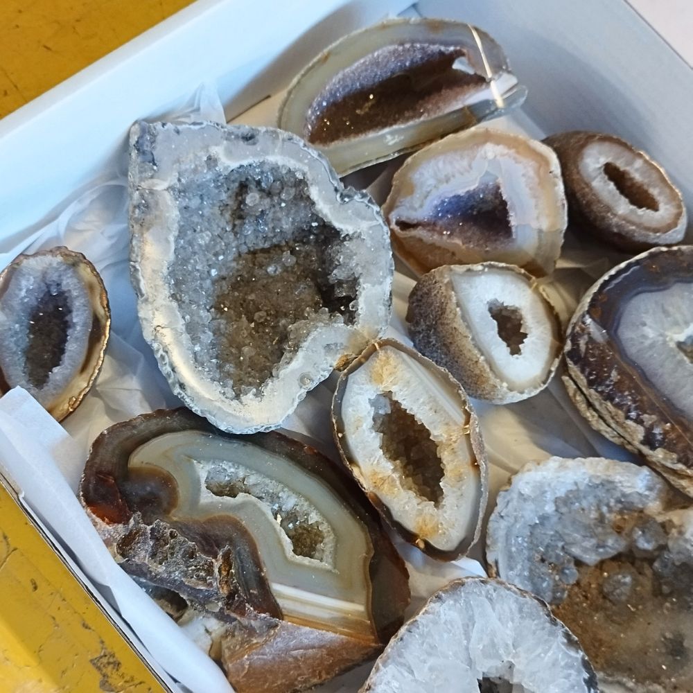Al abrirlas, revelan un interior que puede ser hueco, estar lleno de ágata sólida o presentar un corazón de microcristales de cuarzo. Muy apreciadas en decoración y coleccionismo, destacan por su asombrosa variedad cromática, su dureza y el hipnótico contraste entre su corteza exterior rústica y su núcleo pulido o cristalino.