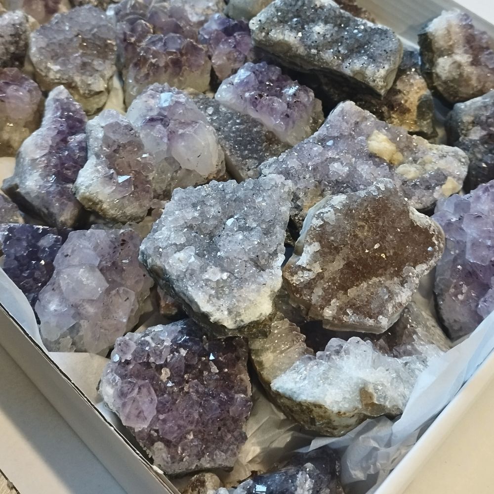 Las drusas de amatista son formaciones naturales donde pequeños cristales de amatista cubren la superficie de una roca base, creando un brillo cautivador. Su belleza reside en el profundo color violeta de los cristales y su efecto escarchado. Se originan en cavidades de rocas volcánicas, donde soluciones ricas en sílice y hierro se enfrían lentamente, permitiendo el crecimiento de estos cristales a lo largo de miles de años.