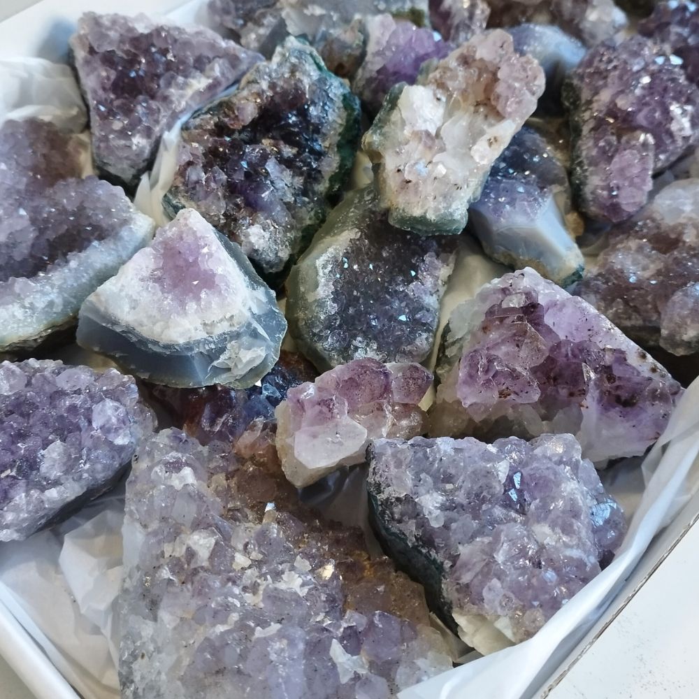 Las drusas de amatista son formaciones naturales donde pequeños cristales de amatista cubren la superficie de una roca base, creando un brillo cautivador. Su belleza reside en el profundo color violeta de los cristales y su efecto escarchado. Se originan en cavidades de rocas volcánicas, donde soluciones ricas en sílice y hierro se enfrían lentamente, permitiendo el crecimiento de estos cristales a lo largo de miles de años.