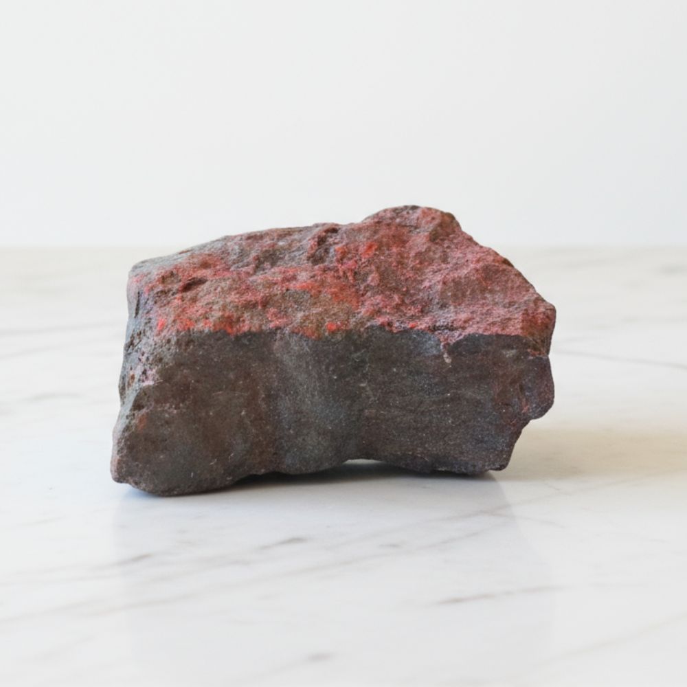 Todos los ejemplares contienen vetas de Cinabrio rojo intenso. Al trocearlo en la mayoría de ejemplares se consiguen más disposiciones de Cinabrio.